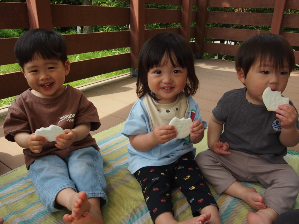 おやつも食べ、元気いっぱいに走ったり生き物を見つけたり、遊具で遊んだりして遊びました。いつもとちょっと違う雰囲気にわくわくの子どもたちです💗