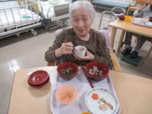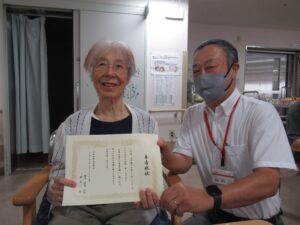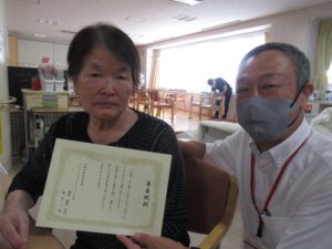 午後は園長より、園長よりお祝いの言葉を頂き、祝い年の方へ祝い状と全利用者様へ記念品の贈呈と