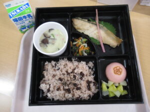 赤飯・鮭の粕漬け焼き・小松菜の柚香和え・上用饅頭・お吸い物 でした。
