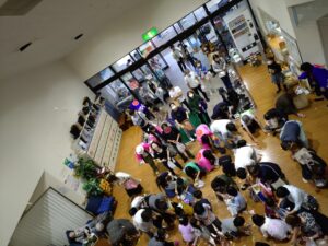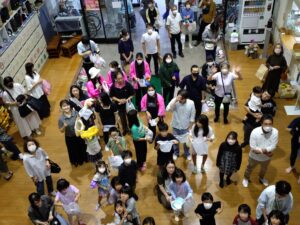 雨天のため屋内で菓子まきを行い、たくさんのお菓子が降ってきました🍬🍭