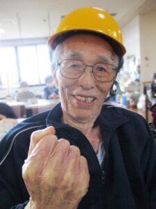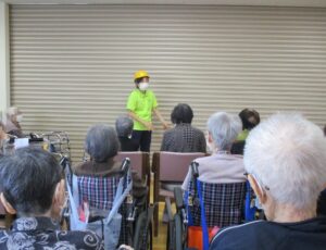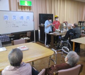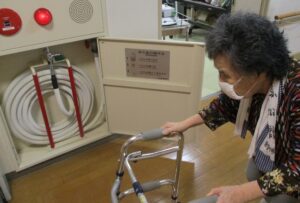 防災設備の確認とデイサービス利用中に水害・火災にあったら…というシナリオで避難訓練を行いました。「備蓄品はどうなっている?」「一人暮らしはどうしたらいい?」と質問もあり、皆さん、真剣に取り組まれていました。また、防火シャッターを実際に作動させ、防火扉の確認も行いました。