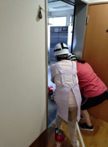 声を出しながら、初期消火行っています。言葉をかけながら、転ばないようにしっかり付き添います!