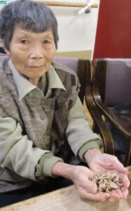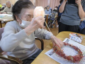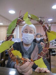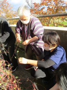 ひとつめは、ベランダで皆さまと育てた朝顔のツルを使ったリースです。鉢からツルを切り取り、それを束ねて糸で巻き、落ち葉で飾り付けしました。皆さま見事な手さばきで、素晴らしい出来栄えになりました!