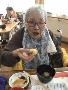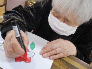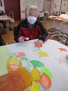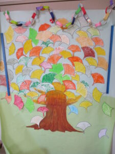 ふたつめは、イチョウの壁面飾りです。イチョウの葉に色を塗り、貼り付けて、1本の大きなイチョウの木に仕上げました。たくさんの葉っぱを茂らせ、立派になったイチョウの木をご覧になり「すごいね~」「できたね~!」と皆さまご満悦でした!