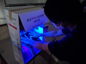 感染症対策ではブラックライトを使用し、手洗いの確認を👐