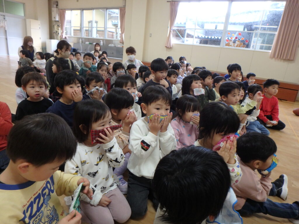 保育士の指示で遊戯室に避難するときには、自然とハンカチを出して口に当てる子どももいて、毎月の避難訓練の成果が発揮されていました。