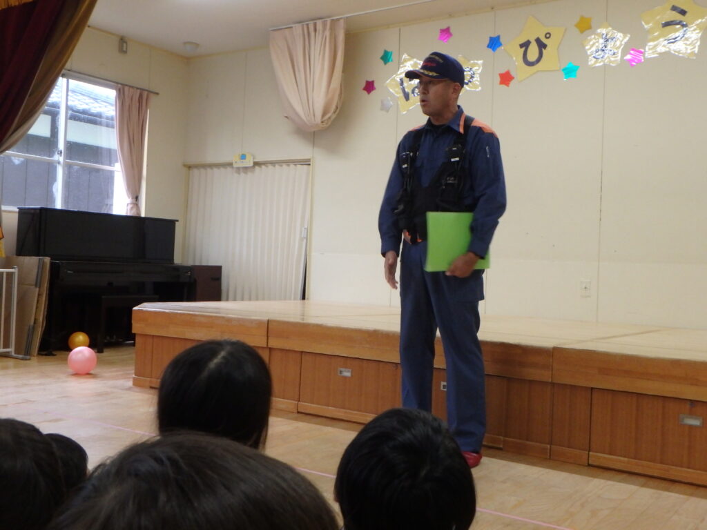 消防士の方からも「子ども達の避難の仕方が大変良かったです」とお褒めの言葉をいただき、「これからも非常ベルがなったら必ず先生のところに集まってください」とお話がありました。