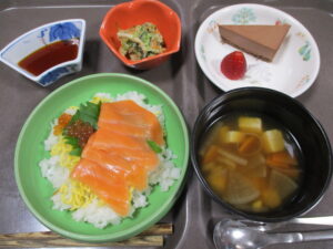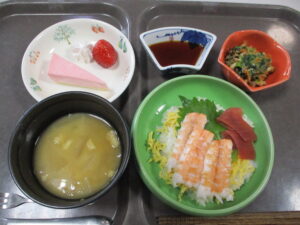 12/4からはマグロ、エビの海鮮ちらしにほうれん草のゴマ和え、粕汁、デザート。12/8からはサーモン、イクラの海鮮ちらしに小松菜のくるみ和え、けんちん汁、デザート。どちらもボリューム満点でした。