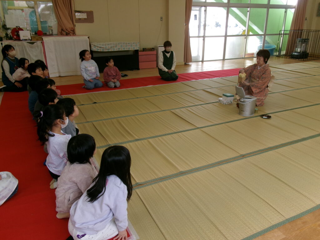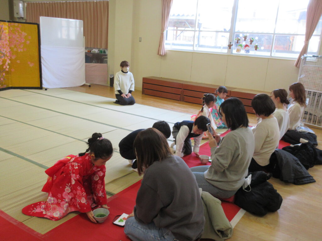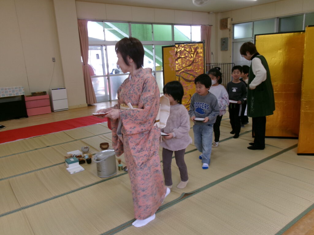 保育園のお茶会は年長児が保護者の方や他クラスのお友だちにお茶をお運びします。