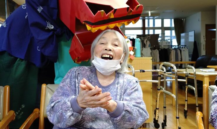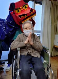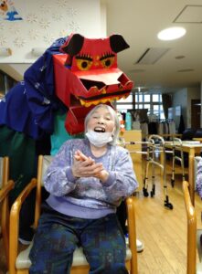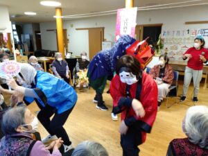 獅子舞、おかめ、ひょっとこが新年会を盛り上げます!「わぁ~!獅子に頭を噛んでもらえたから良い年になるね!」