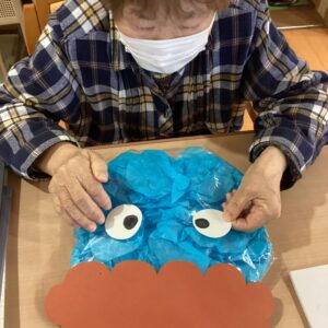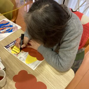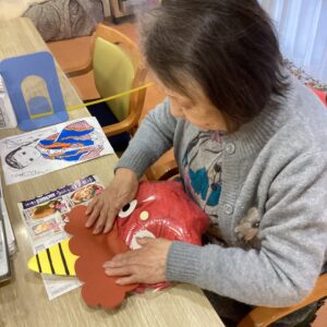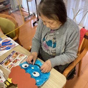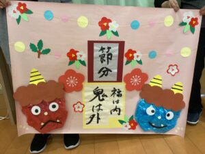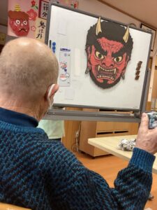 新聞紙を丸めて豆に見立て、ホワイトボードに貼った鬼の面に「鬼は外、福は内」と大きな声を出して鬼退治です。