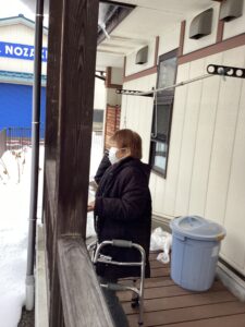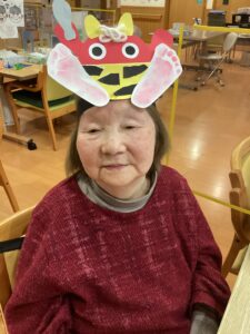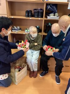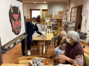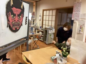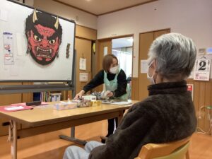 交流のある田島わくわくこども園の保育士さんが園児さんたちが作った鬼の面と豆を入れる枡と炒った大豆を持ってきてくださいました。