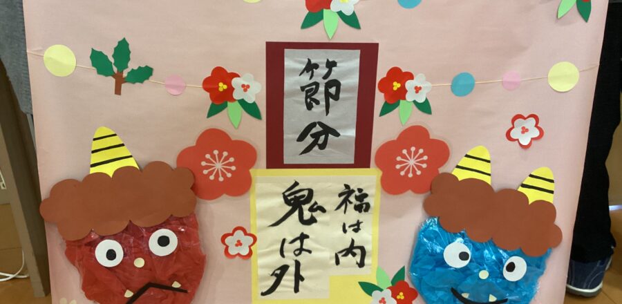 新聞紙を丸めて豆に見立て、ホワイトボードに貼った鬼の面に「鬼は外、福は内」と大きな声を出して鬼退治です。