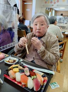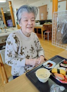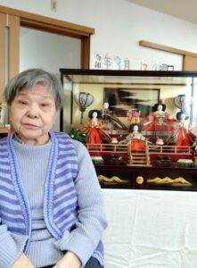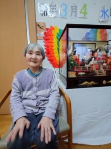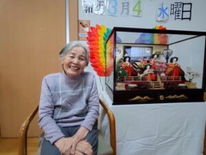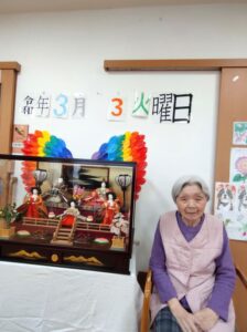 「ひな祭りにちらし寿司を頂きましたよ!」お雛さまと一緒に記念撮影