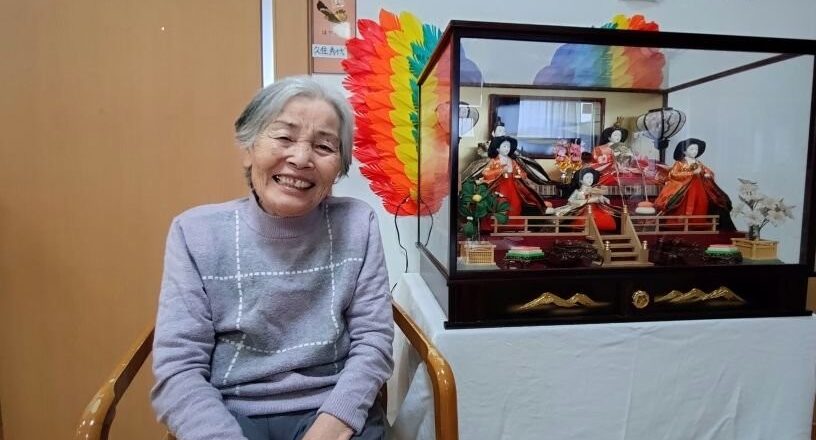 「ひな祭りにちらし寿司を頂きましたよ!」お雛さまと一緒に記念撮影